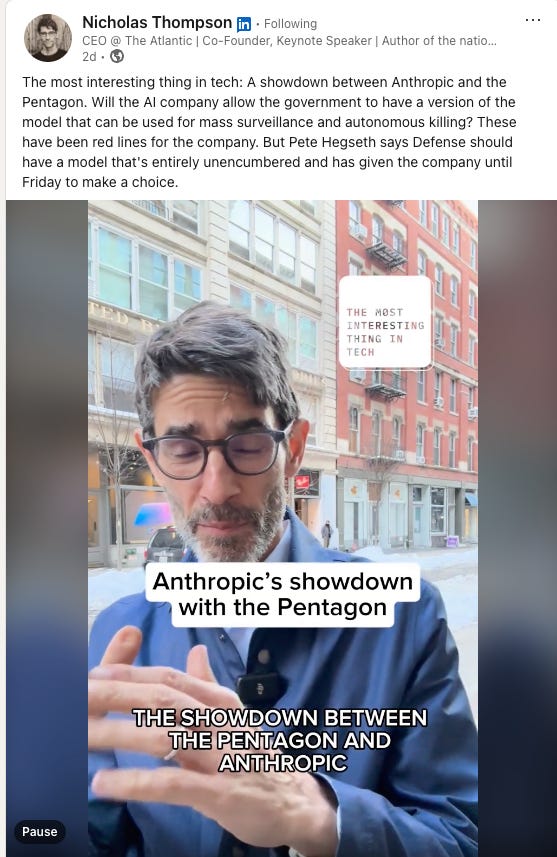 I’m sure you’ve all been reading about this week’s showdown between Anthropic and the Pentagon. Will Anthropic allow the government to have a version of the model that can be used for mass surveillance and autonomous killing? As ever, I enjoyed Nicholas Thompson’s coverage on what’s at stake in his “Most Interesting Things in Tech” update on LinkedIn, it is worth you checking out 👀